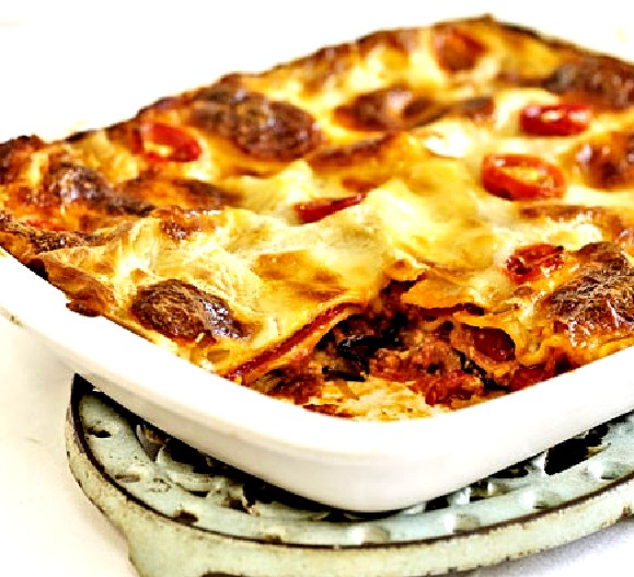 Top with a layer of lasagne, then drizzle over a quarter of the white sauce. Repeat until you have three layers of pasta.