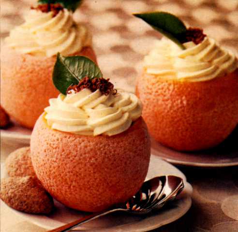 Twenty minutes before serving transfer the oranges to the refrigerator to soften a little. Just before serving decorate the tops with piped whipped cream and dust with grated chocolate. Spike each orange with a bay leaf and serve with petit fours or macaroons