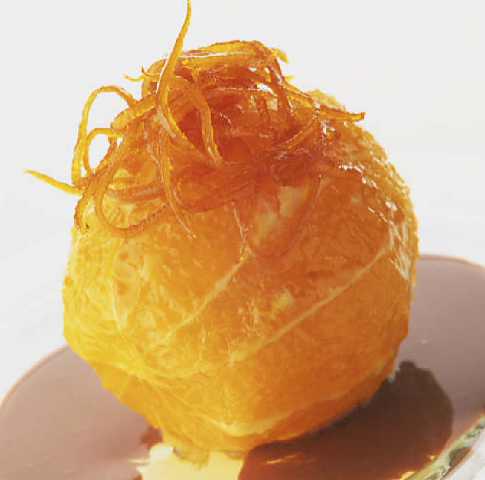 Remove the pan from the heat, stir once, then spoon a little heap of strips like a thatch on top of each orange. Chill before serving.