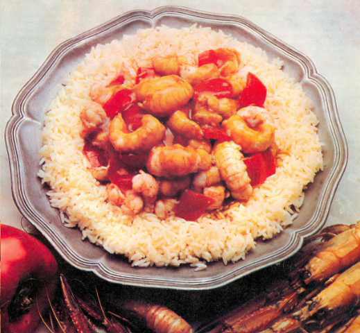 Arrange the prawns on top of the rice and pour the hot sauce over them. Serve immediately.