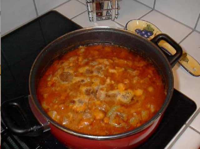 Put the meat, onion mixture and potato into a large casserole and mix well. Pour the tomato mixture over the top, put the lid on the casserole and