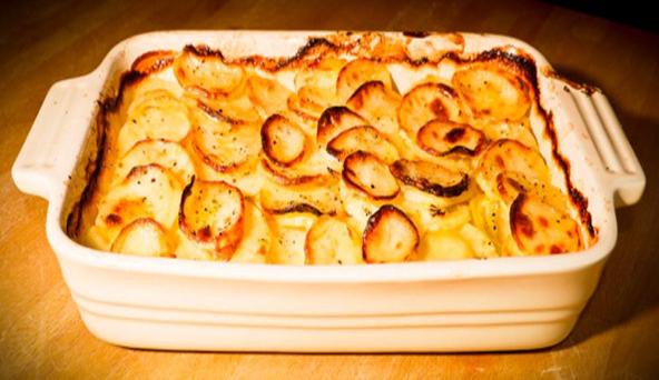 butter all over the potatoes and place the dish on the highest shelf of the oven for 50-60 minutes, until the top is crisp and golden and the underneath is creamy and